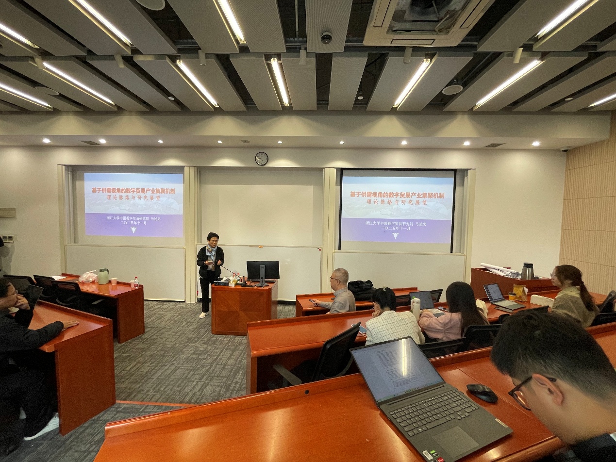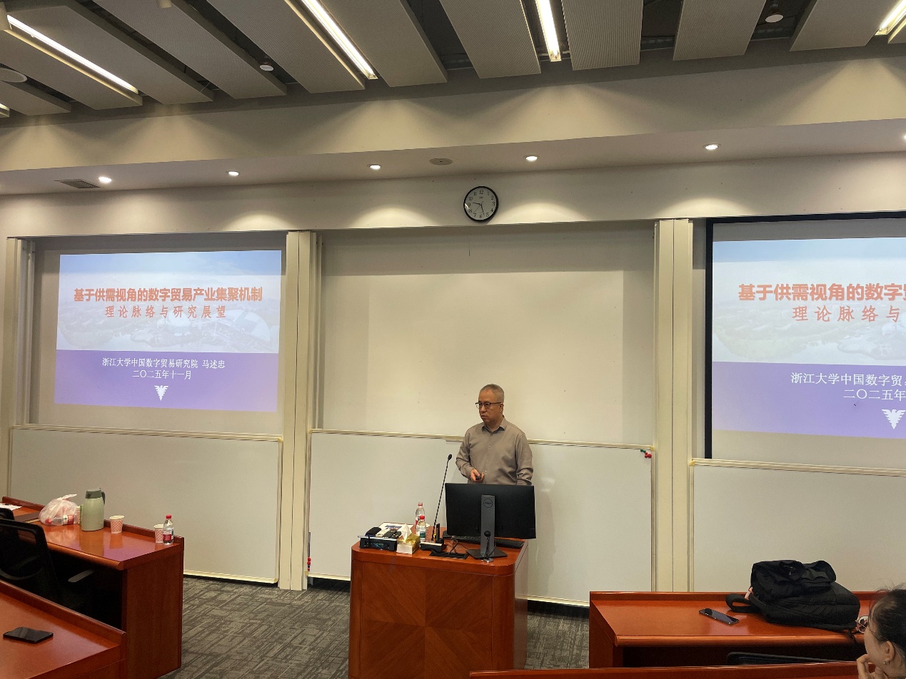 2025年11月7日上午,由我院主办的“基于供需视角的数字贸易产业集聚机制理论脉络与研究展望” 数字经济研究前沿专题讲座在同济大厦A楼306教室举办。本次讲座特邀浙江大学中国数字贸易研究院马述忠教授担任主讲嘉宾,系统阐释数字贸易产业集聚机制。