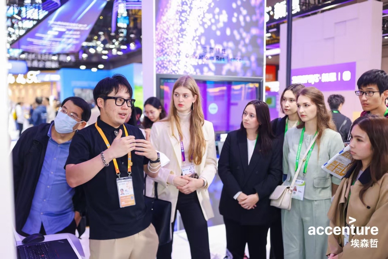 The first stop of the group was the Accenture stand, themed around “Reinventing Enterprise Resilience.” Accenture showcased how it builds forward-looking business resilience through “Agentic AI”. During the discussion, Accenture emphasized the strategic importance of co-innovating with enterprises and introduced solutions such as the “AI Refinery” platform, designed to help businesses reengineer processes, boost efficiency, and achieve predictive risk management, accelerated decision-making and breakthrough growth.