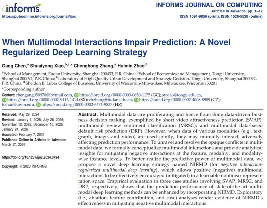 In the digital intelligence era, multimodal data (text, audio, images, video) has become essential for understanding user intentions and enabling data-driven decisions. However, semantic gaps and information conflicts across modalities often limit model performance. To address these challenges, Associate Professor Shuaiyong XIAO from the Department of Management Science and Engineering of School of Economics and Management, Tongji University (Tongji SEM) has advanced multimodal user behavior modeling and intelligent inference, with two collaborative papers accepted by top-tier journals.