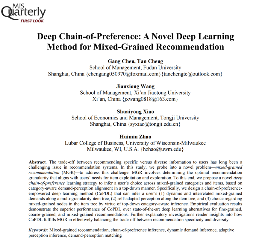 The MIS Quarterly paper introduces a mixed-grained recommendation framework with hierarchical preference chains, enabling dynamic balance between item-level and category-level recommendations for more accurate user intention matching.